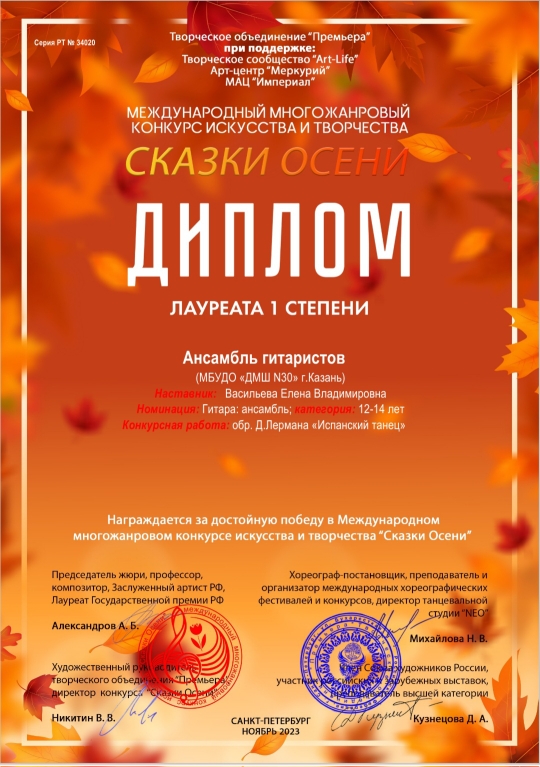 Международный фестиваль-конкурс искусств "Золотое сердце осени" - ансамбль гитаристов - I место