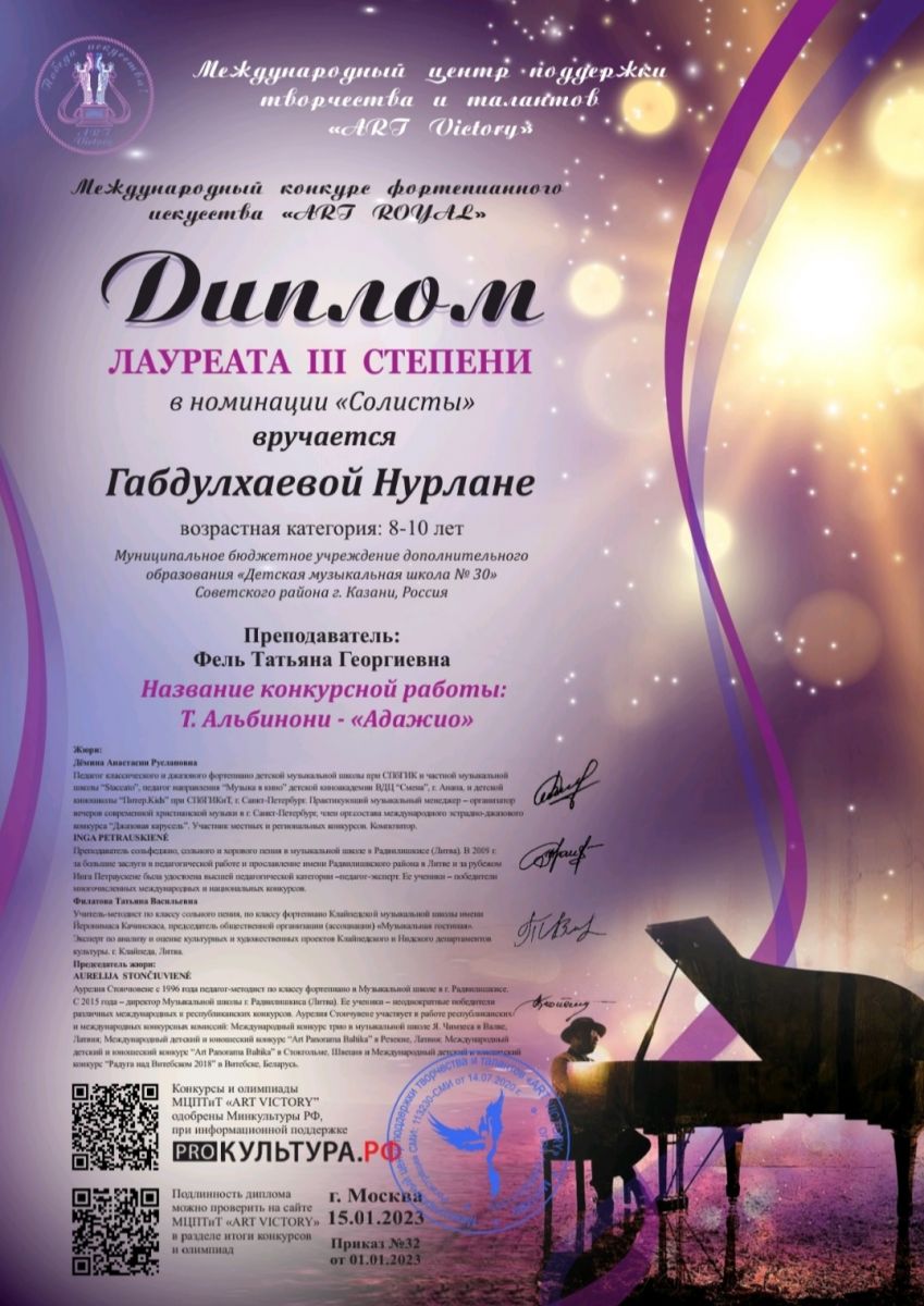 Международный конкурс фортепианного искусства "ART ROYAL" - Габдулхаева Нурлана - III место