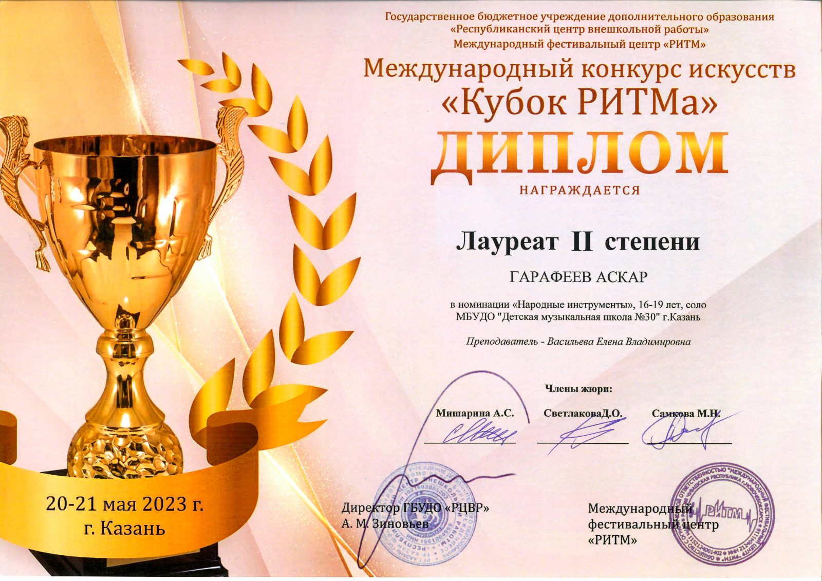 Международный конкурс искусств "Кубок РИТМа" - Гарафеев Аскар - II место