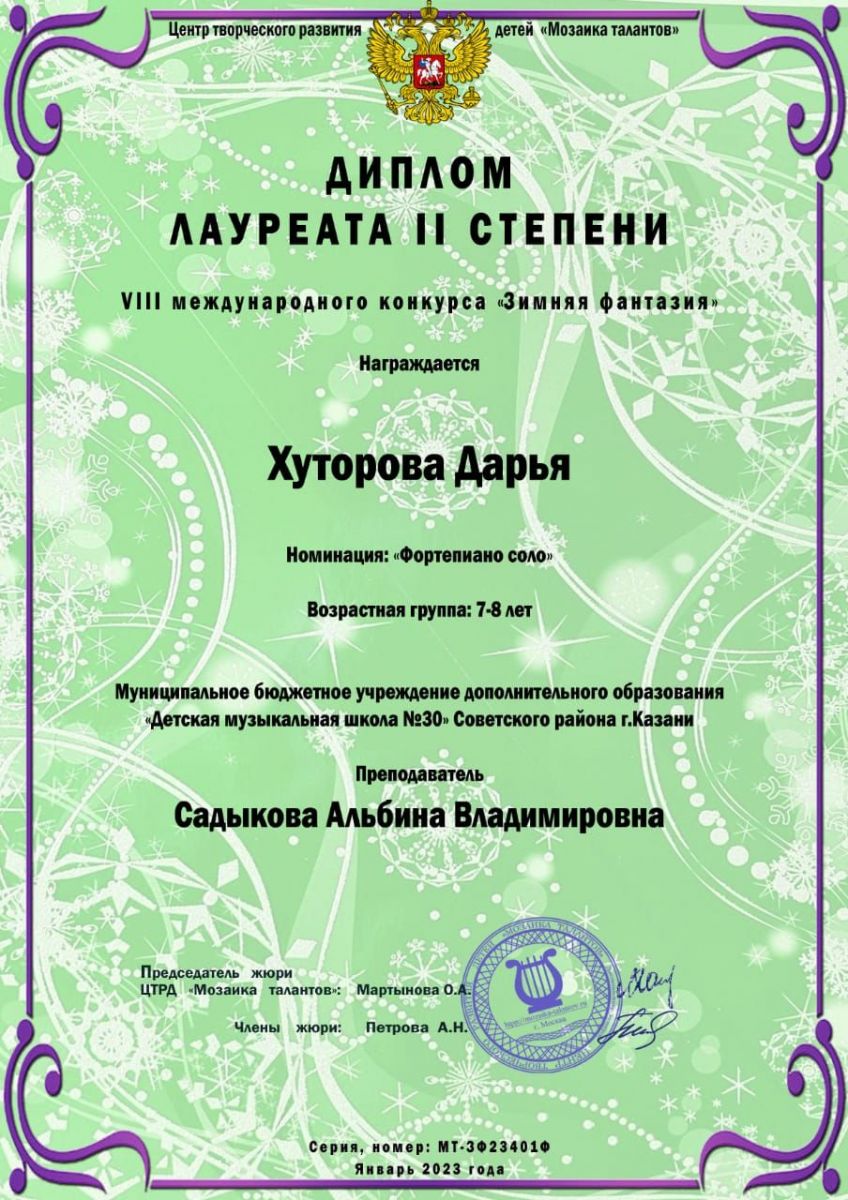VIII Международный конкурс "Зимняя фантазия" - Хуторова Дарья - II место