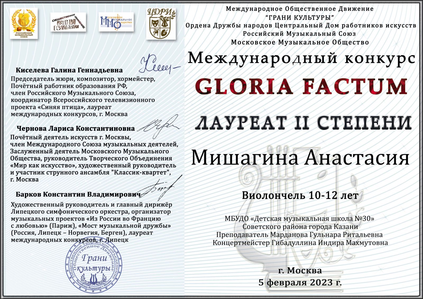 Международный конкурс "Gloria factum" - Мишагина Анастасия - II место
