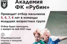 Уважаемые родители! Академия ФК "Рубин" проводит отбор мальчиков 5, 6, 7, 8 лет в команды младших возрастных групп. Отбор будет проходить с января по май 2021 года.