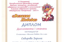 Наша маленькая звездочка Сабирова Зарина стала Дипломантом I степени в номинации "Великая Победа" III Открытого Республиканского фестиваля - конкурса детских, юношеских, молодежных, творческих коллективов и исполнителей в рамках творческого проекта "Жемчужинка Татарстана - 2017"