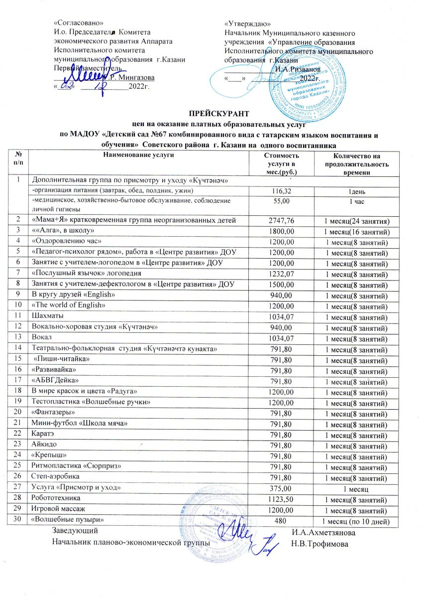 Прейскурант цен на дополнительные платные образовательные услуги