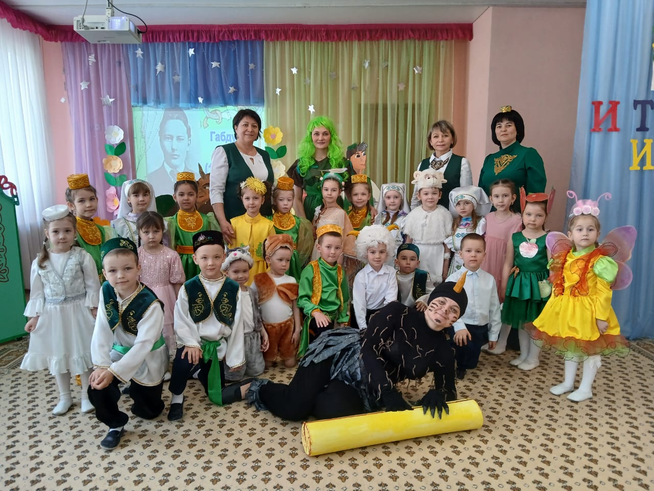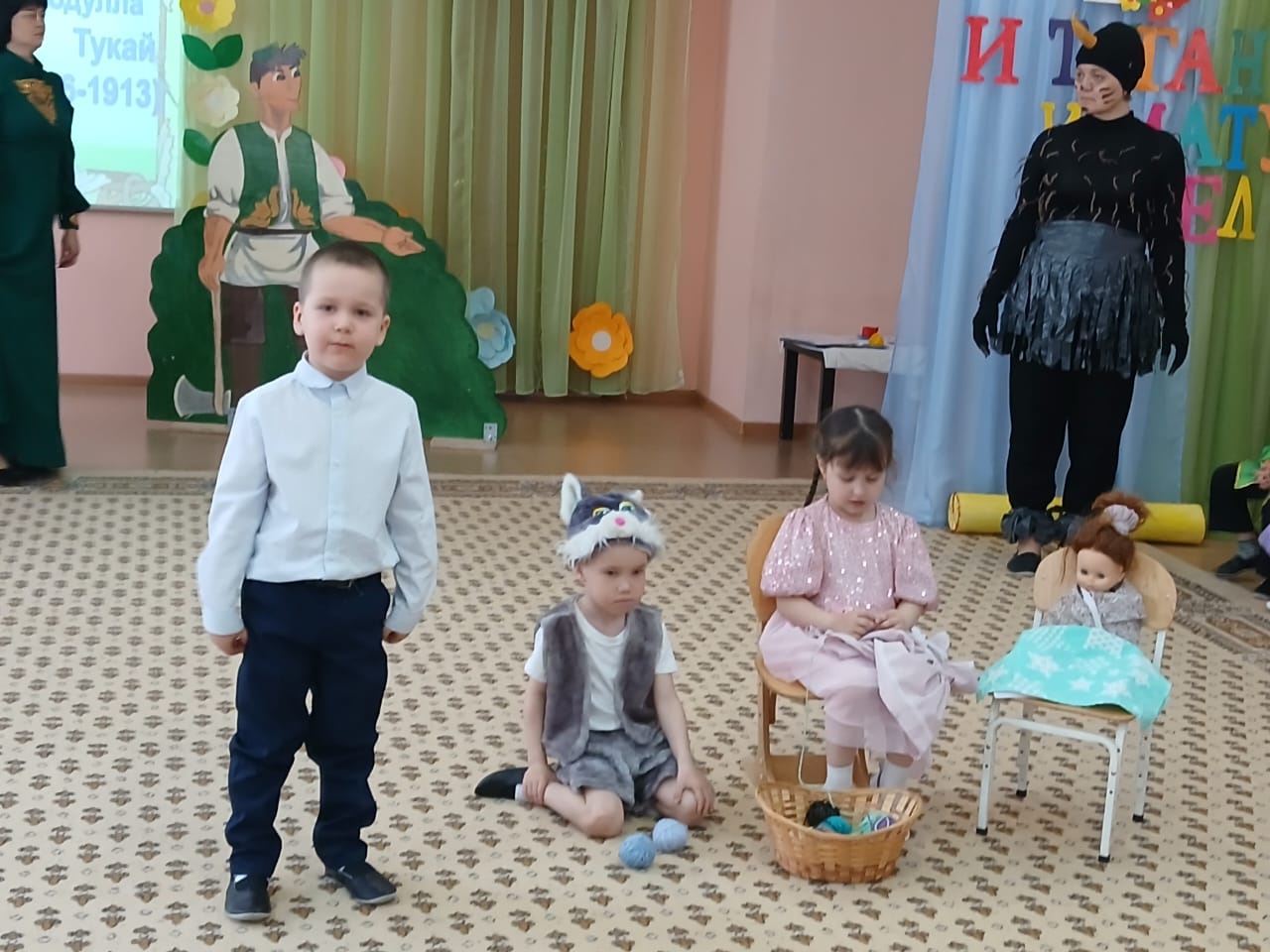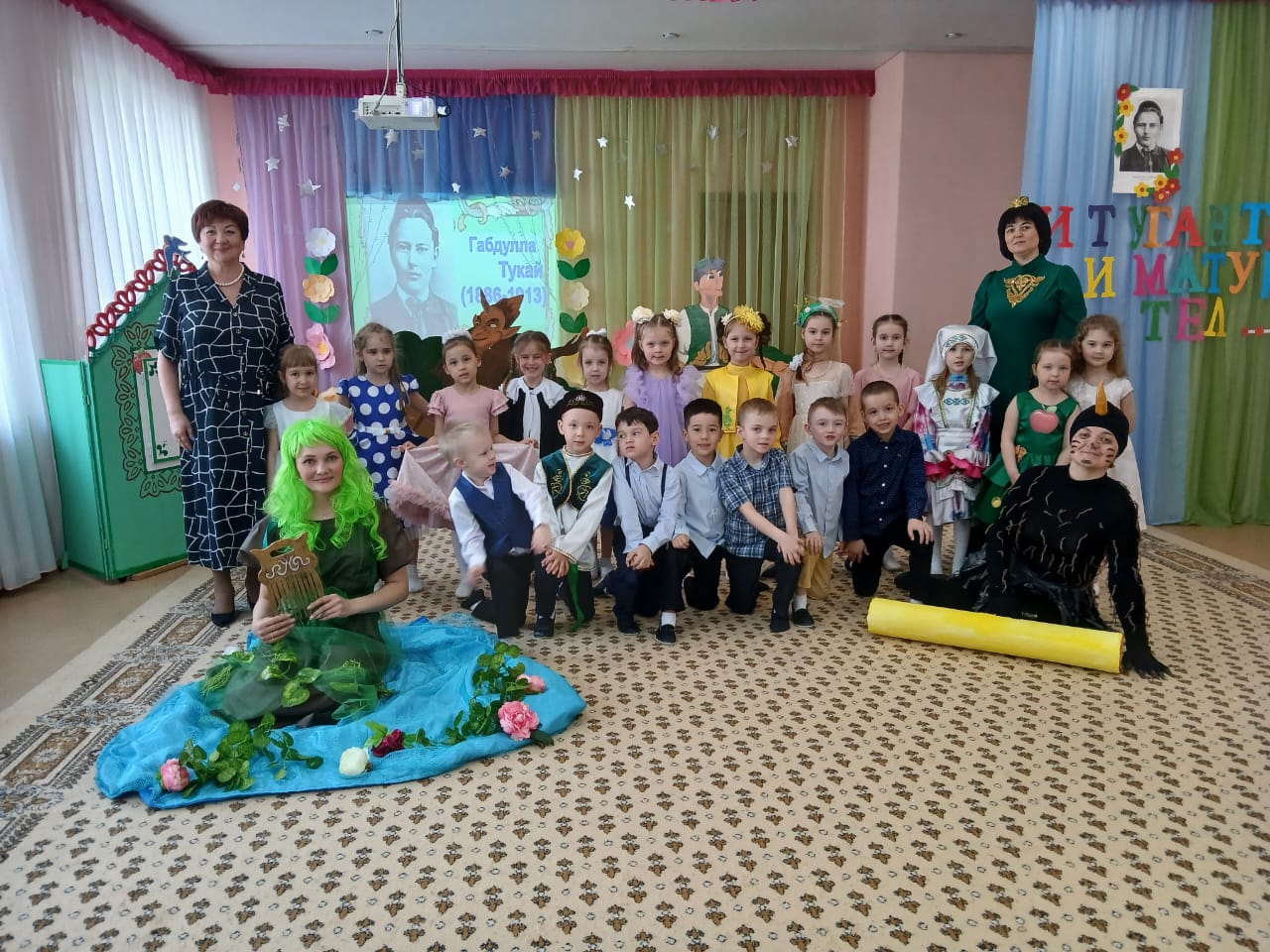 Бүген безнең балалар бакчасында бөек татар шагыйре Габдулла Тукайның туган көненә багышланган чара узды. Балалар Габдулла Тукай әсәрләрен теләп укыдылар, сәхнәләштерделәр, җырлар башкардылар, уеннар уйнадылар. Балаларга кунакка әкият геройлары: Шүрәле, Су анасы килде .Тукай китаплары туган якның матурлыгын, игелеген бәяләргә өйрәтә, мәрхәмәтле, гадел һәм кыю булырга өнди. Бәйрәм азагында балалар белән педагоглар татар халкының гимнына әверелгән "Туган тел" җырын башкардылар.Сегодня в нашем детском саду прошло мероприятие, посвященное Дню рождения великого татарского поэта Габдуллы Тукая. Дети с желанием читали и инсценировали произведения Габдуллы Тукая, исполняли песни, играли в игры. В гости к ребятам пришли герои сказок: Шүрәле, Водяная .Книги Тукая учат ценить красоту родного края, доброте, призывают быть милосердным, справедливым и смелым. И в конце в завершении праздника педагоги с детьми исполнили песню "Туган тел", которая стала гимном татарского народа.
