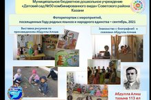15 сентября в детском саду в рамках Года родных языков и народного единства прошли мероприятия, посвященные творчеству татарского писателя Абдуллы Алиша. Мероприятия начинались обзором книжной выставки. Дети просматривали книги, журналы, презентации, знакомились с творчеством писателя. Посмотрели несколько мультфильмов, снятых по сказкам А. Алиша. Затем рисовали понравившегося героя сказки и организовали выставки рисунков. Дети младших и средних групп посмотрели театрализацию сказки «Куян кызы» в исполнении юных артистов группы №1. 15 сентября в детском саду в рамках Года родных языков и народного единства прошли мероприятия посвященные творчеству татарского писателя Абдуллы Алиша. Мероприятия начинались обзором книжной выставки. Дети просматривали книги, журналы, презентации, знакомились с творчеством писателя. Посмотрели несколько мультфильмов, снятых по сказкам А. Алиша. Затем рисовали понравившегося героя сказки и организовали выставки рисунков. Дети младших и средних групп посмотрели театрализацию сказки «Куян кызы» в исполнении юных артистов группы №1.