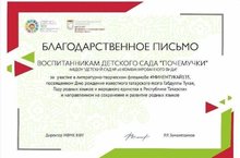 Благодарственное письмо воспитанникам детского сада "Почемучки" за активное участие в литературно-творческом флешмобе #МИНЕМТУКАЙ135, организованный ИФМК КФУ.