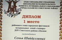 Поздравляем победителей районного этапа городского фестиваля музыкальных семей "Аккорд" среди ДОУ Советского района г.Казани в номинации "К 100 - летию ТАССР". Дипломом 1 степени награждена семья Шайдуллиных, дипломом 2 степени награждена семья Шаеховых. Спасибо за активное участие! Желаем дальнейших творческих успехов!