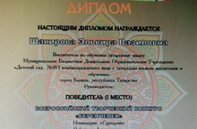 Дипломом победителя 1 место Всероссийского творческого конкурса "Беренчелек" за работу "Ачык авыз" награждается воспитатель по воспитанию и обучению татарского языка- Шакирова Эльвира Вазилевна. Поздравляем!!!