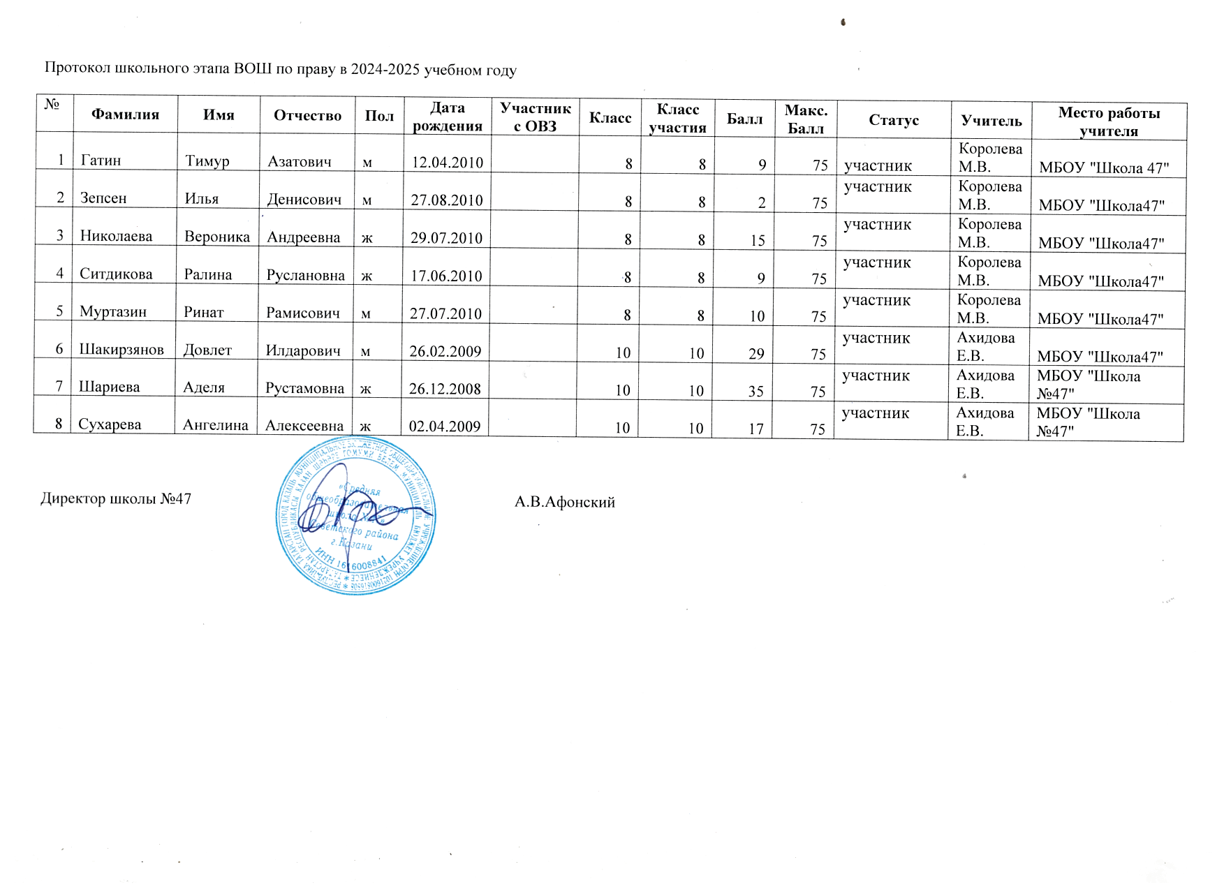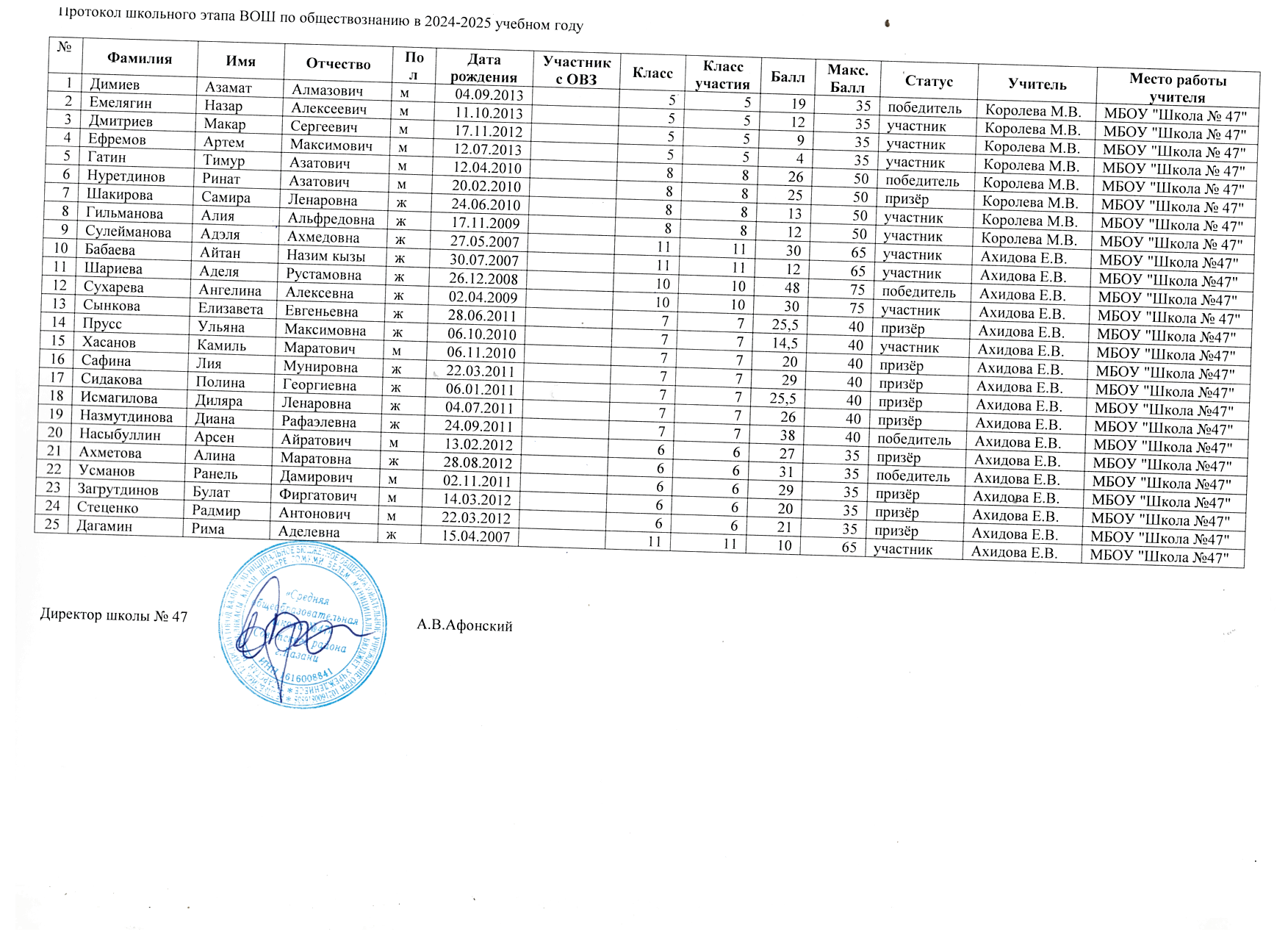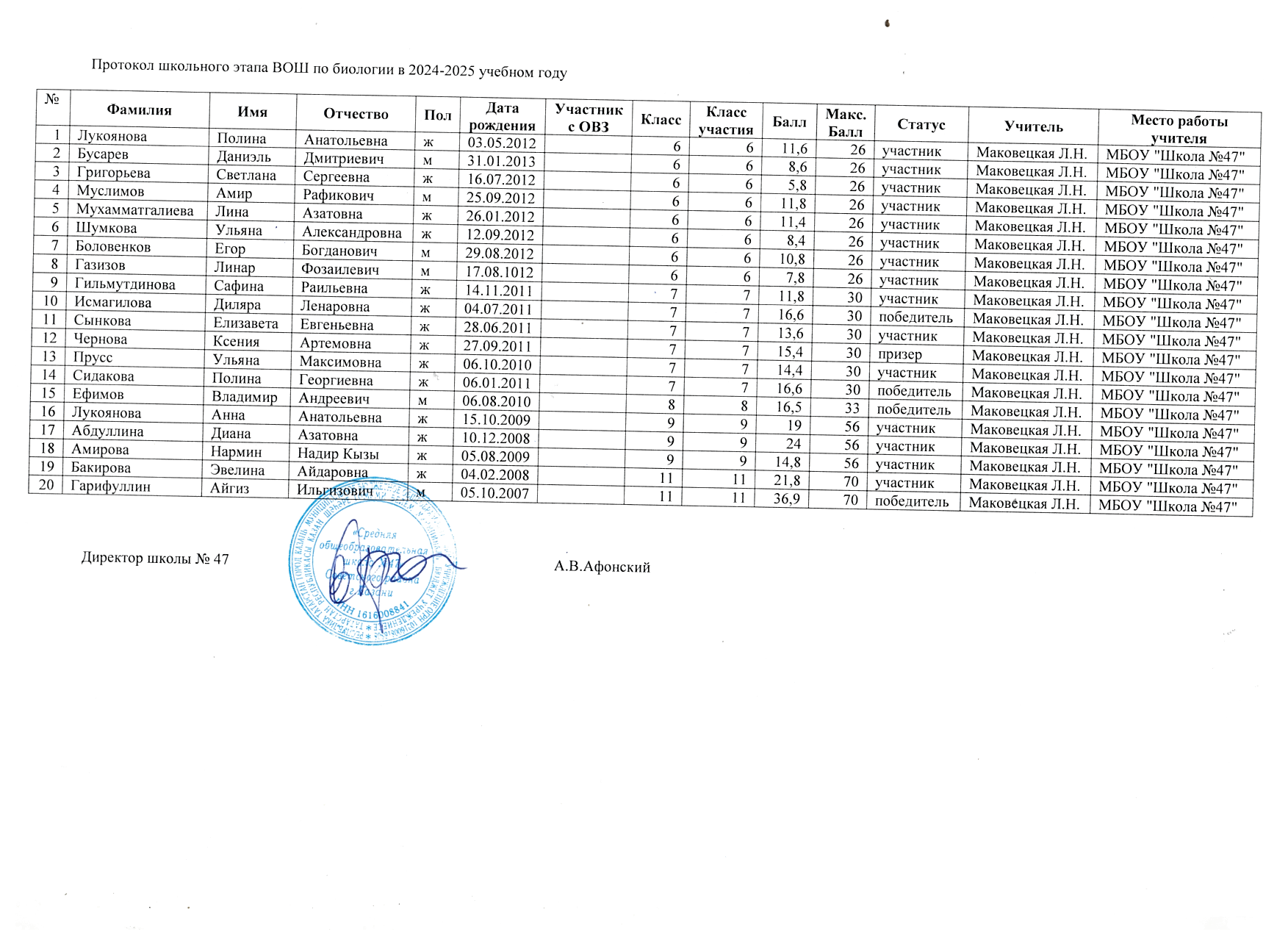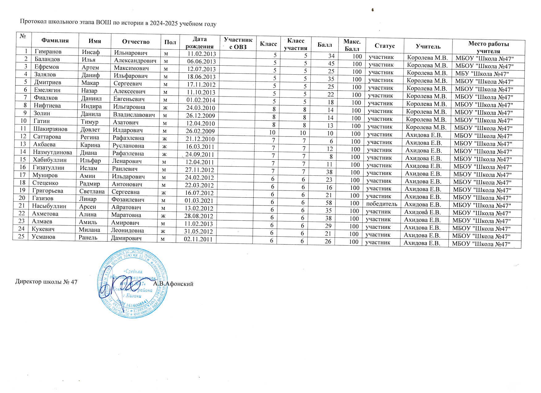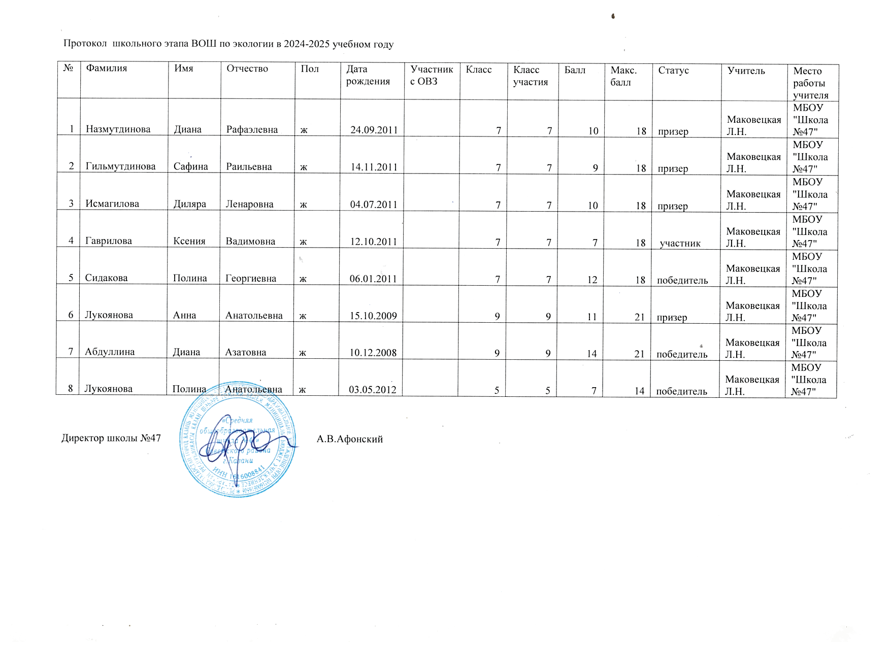 Протоколы школьного этапа Всероссийской олимпиады школьников по предметам: