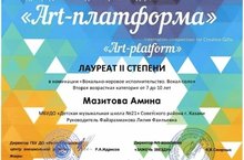 Поздравляем Юсупова Даниса и Мазитову Амину ( преподаватель Файзрахманова Л.Ф. ) с победой на конкурсе и званием лауреата 2 степени на Международном конкурсе "Арт платформа" Поздравляем, желаем покорения новых творческих вершин!