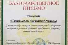 6 марта 2018 года В Управлении образования г.Казани прошел праздничный концерт, посвященный 8 Марта! На этом мероприятии выступила Шахмаметова Джамиля Юсиповна преподаватель по вокалу Детской музыкальной школы №21. Администрация ДМШ №21 выражает Вам благодарность за содействие, активное участие и профессионализм!!! СПАСИБО!!!