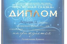 Галимуллину Камиллу(преп.Файзрахманова Л.Ф.) с присуждением звания ЛАУРЕАТА II СТЕПЕНИ в Международном конкурсе-фестивале музыкально-художественного творчества "Восточная сказка"