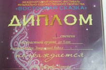 Поздравляем!!! Камалетдинову Латифу , класс преподавателя Шахмаметовой Джамили Юсиповны, с присуждением звания Дипломанта I степени Международного конкурса-фестиваля музыкально-художественного творчества "Восточная сказка"
