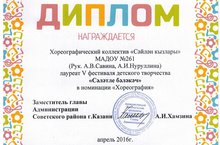 9 апреля в ДК "Сайдаш" прошел гала-концерт v фестиваля детского творчества "Сәләтле бәләкәч". Наш хореографический коллектив "Сәйлән кызлары" выступил с ярким весенним татарским танцем "Яз нурлары" и был награжден дипломом.