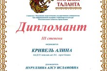 В зимние каникулы воспитанница нашего детского сада Кривель Алина участвовала В Международном фестивале-конкурсе "На крыльях таланта" в городе Казани, где прошли конкурсные выступления по номинациям: вокал эстрадный, художественное слово. Мы от всей души поздравляем Алину Кривель с победой! Она стала дипломантом 3 степени в номинации вокал эстрадный.