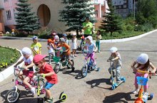 В детском саду прошёл велопробег. Дети с удовольствием катались на велосипедах, самокатах и даже роликах. На этом спортивном мероприятии главным было участие, а не победа. Все юные спортсмены были награждены сладкими призами.