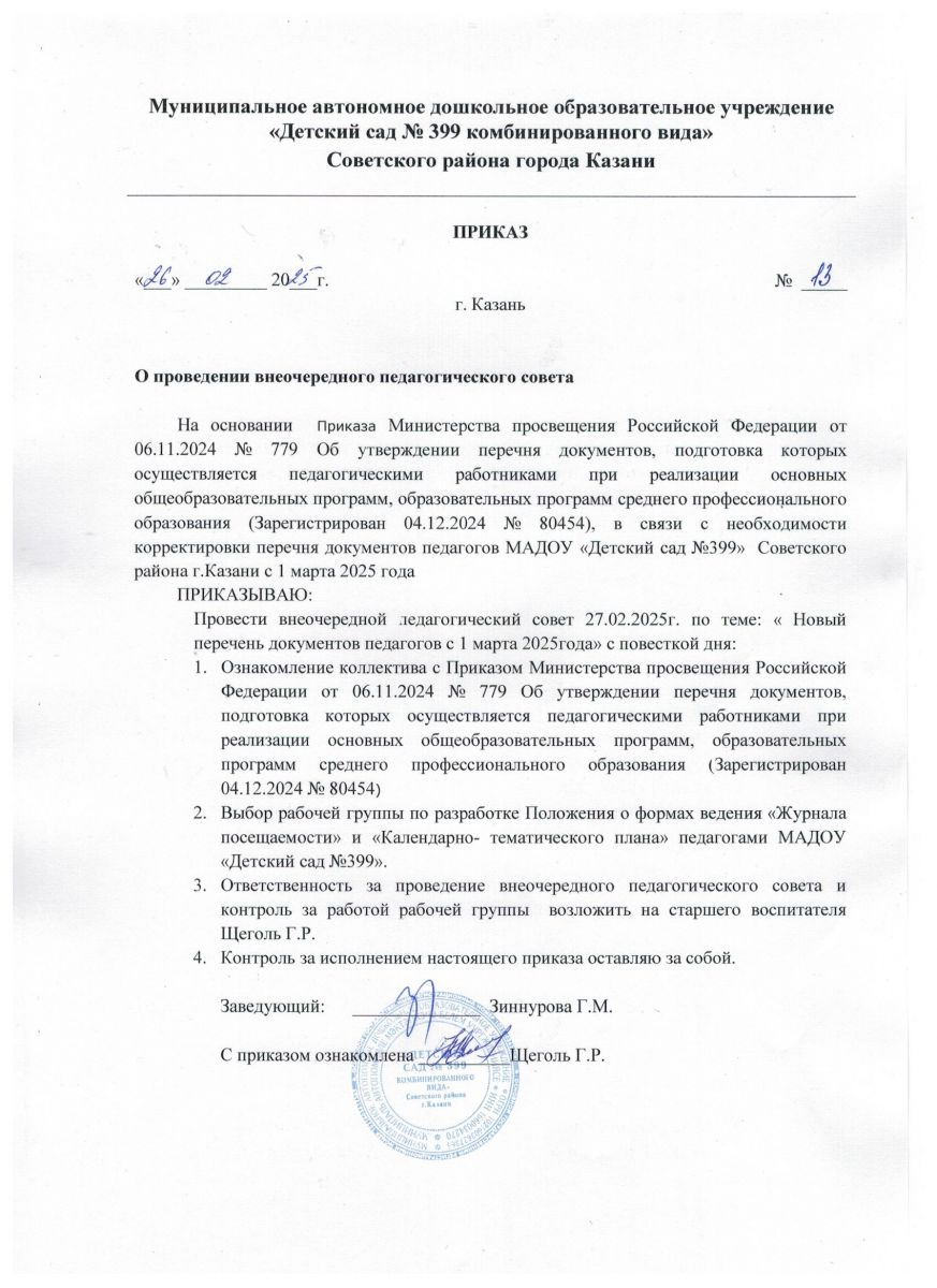 Приказ Министерства просвещения Российской Федерации от 06.11.2024 № 779 Об утверждении перечня документов, подготовка которых осуществляется педагогическими работниками при реализации основных общеобразовательных программ, образовательных программ среднего профессионального образования (Зарегистрирован 04.12.2024 № 80454)