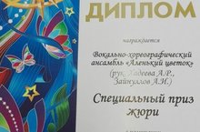Наши воспитанники: Вокально-хореографический ансамбль "Аленький цветок" ( рук. Хадеева А.Р., Зайнуллов А.И.) награждены ДИПЛОМОМ РАЙОННОГО ОТБОРОЧНОГО ТУРА ОТКРЫТОГО РЕСПУБЛИКАНСКОГО ТЕЛЕВИЗИОННОГО МОЛОДЕЖНОГО ФЕСТИВАЛЯ ЭСТРАДНОГО ИСКУССТВА СОЗВЕЗДИЕ - ЙОЛДЫЗЛЫК "СПЕЦИАЛЬНЫЙ ПРИЗ ЖЮРИ" в номинации "Хореография, младшая группа".