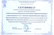 Авторская учебно-методическая программа организации коррекционной работы с дошкольниками 4-7 лет с тяжёлыми нарушениями речи "Карусель" коллектива детского сада вошла в городской реестр инновационных программ, проектов и методических разработок.