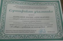 Воспитатель детского сада Марисова Марина Александровна - дипломант (2 место) городского этапа III республиканского конкурса русскоязычных педагогов "Я говорю и работаю на татарском - 2016". 28 ноября 2016 года в Управлении образовании г.Казани состоялось награждение победителей и участников.