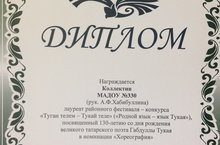 Диплом лауреат районного фестиваля-конкурса "Туган теле-Тукай теле" 05.04.2016