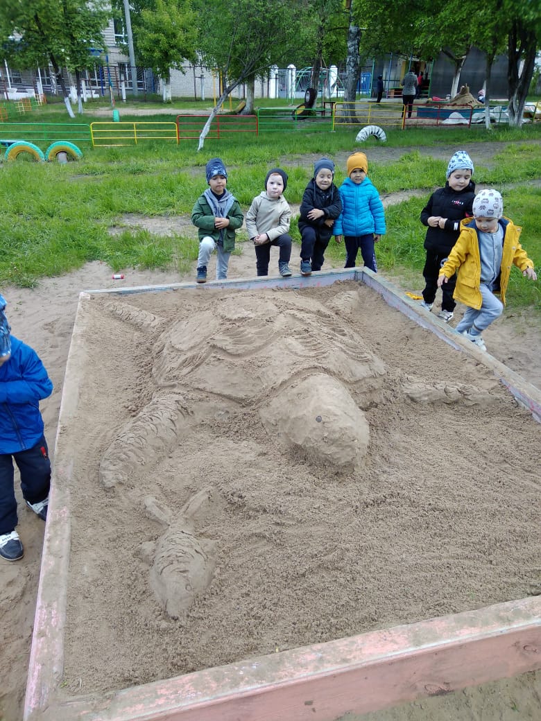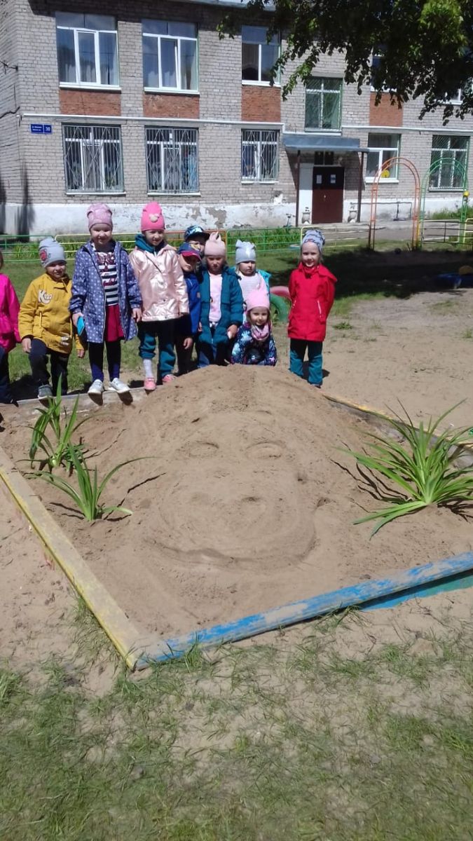 2 группа вместе с воспитателем Гузалией Равиловной фантазируют в песочнице