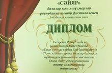 Кош канатсыз, кеше талантсыз булмый. Әлеге сүзләр Кәрим Тинчурин исемендәге Татар дәүләт драма һәм комедия театры бинасында узган “Сәйяр” республика театр фестиваленең йомгаклау этабында еш яңгырады. Катнашучылар бу сүзләрнең дөреслеген чын мәгънәсендә дәлилләде. 167 нче балалар бакчасы да әлеге фестивальдә катнашкан өчен Диплом белән бүләкләнде. Бакчаның театр коллективы конкурска Абдулла Алишның “Сертотмас үрдәк” әкиятен һәм “Бияләй” рус халык әкиятен тәкъдим иткән иде.