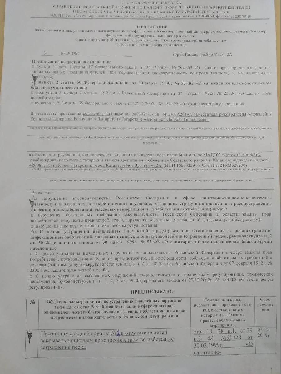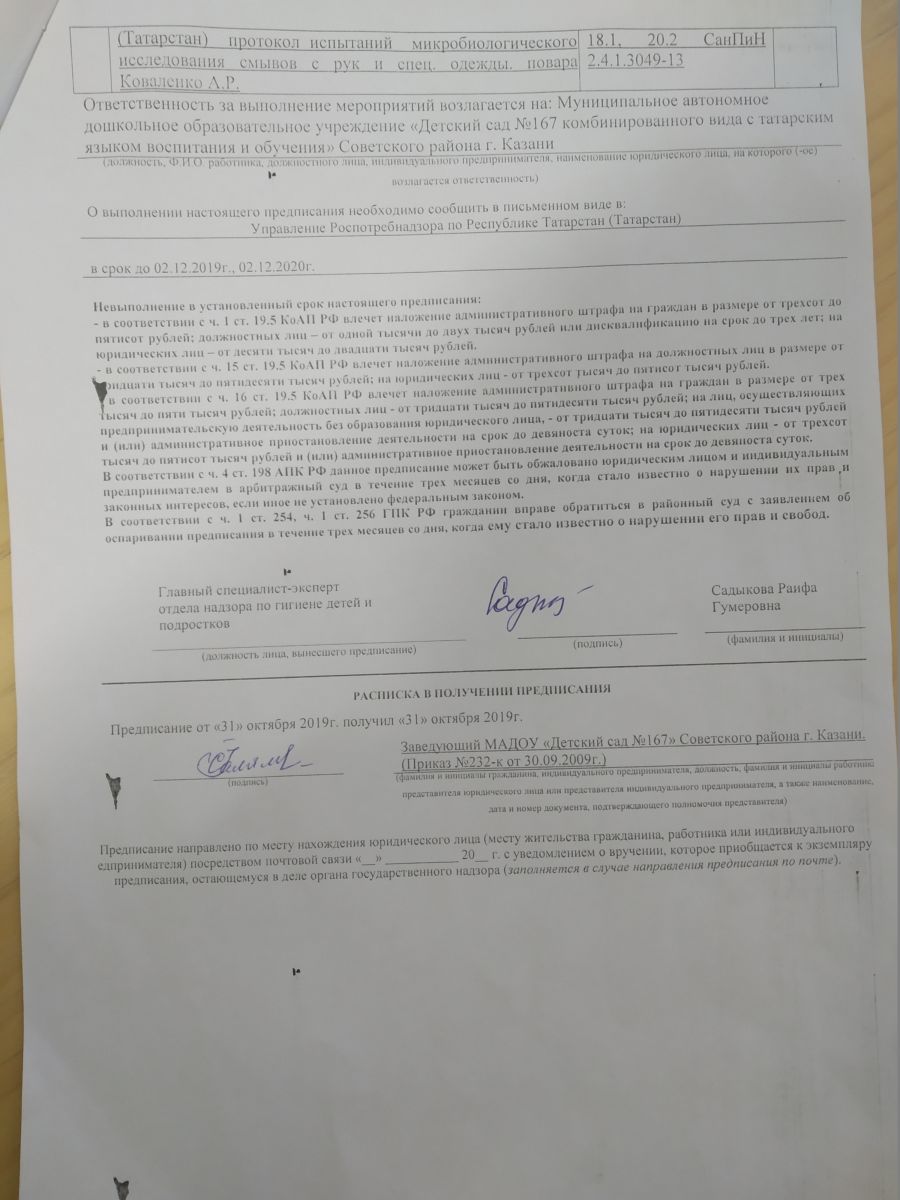 Предписание санитарно-эпидемиологического надзора 2019г.
