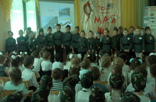 Сегодня в детском саду проходило празднование 70-летия Победы. Сначала была торжественная часть. В ней выступали перед детьми воспитатели-они исполняли поппури из музыки военных лет, пели песню, выступали и дети-читали стихи, выступал хор, а затем состоялся ПАРАД МАЛЫШКОВЫХ ВОЙСК. В параде приняли участие дети средних, старших и подготовительных групп. Сначала командиры сдавали рапорт о готовности, а затем маршировали и пели строевую песню. Каждая группа представляла какой-нибудь род войск: танкисты, артиллеристы, кавалерия, моряки, летчики, автомобильные войска, пехота. Принадлежность к роду войск проявилась в эмблемах. В конце праздника все группы были награждены книгами и все 160 детей и 45 присутствовавших родителей и работников детского сада пели песню "День Победы",