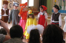 На фотографии старшая группа №5. Дети подготовили для мам и подарили музыкальную сказку "Колобок".