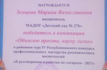 Поздравляем нашу коллегу - Земцову Марину Вячеславовну с победой в номинации "Объясню просто, научу легко" в районном туре IV Республиканского конкурса профессионального мастерства русскоязычных воспитателей "Я разговариваю и работаю на татарском-2017". Желаем творческих успехов!