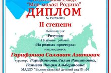 Воспитанник старшей группы - Гарифзянов Салават ( кураторы: Гарифзянова Л.Р., Ганиева Л.А.) принял участие во Всероссийском конкурсе " Моя малая Родина". Он стал призёром и получил диплом II степени. Поздравляем!