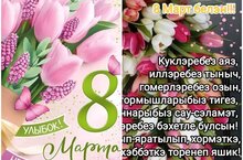 Барыбызга да билгеле әлеге айның иң матур иң олы бәйрәме — Сигезенче март — Халыкара хатын-кызлар көне. Хөрмәтле гүзәл затлар! Табигатнең суыктан җылылык чорына омтылган мизгеленә туры килгән бәйрәмегез һәрвакыт җылы матур истәлекләр генә калдырсын. -