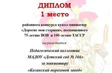 Педагогический коллектив МАДОУ "Детский сад № 166" награжден Дипломом 1 степени за миниатюру "Казанский пороховой завод" в конкурсе кукол - миниатюр "Дорогие мои старики", посвященного 75-летию ВОВ и 100-летию ТАССР.