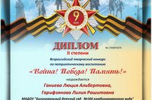 Педагоги Ганиева Люция Альбертовна и Гарифзянова Лилия Рашитовна приняли участие во Всероссийском творческом конкурсе по патриотическому воспитанию " Война! Победа! Память!" Они удостоились дипломов II степени. Поздравляем! Желаем творческих успехов!