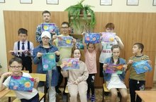 На очередном занятии ребята рисовали космос. С помощью простых подручных материалов нарисовали планеты. Делали фактуру на поверхности планеты и потом делали звезды. Ребятам очень понравилось.