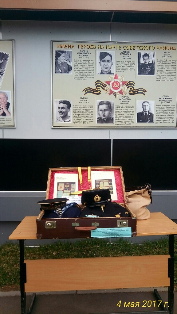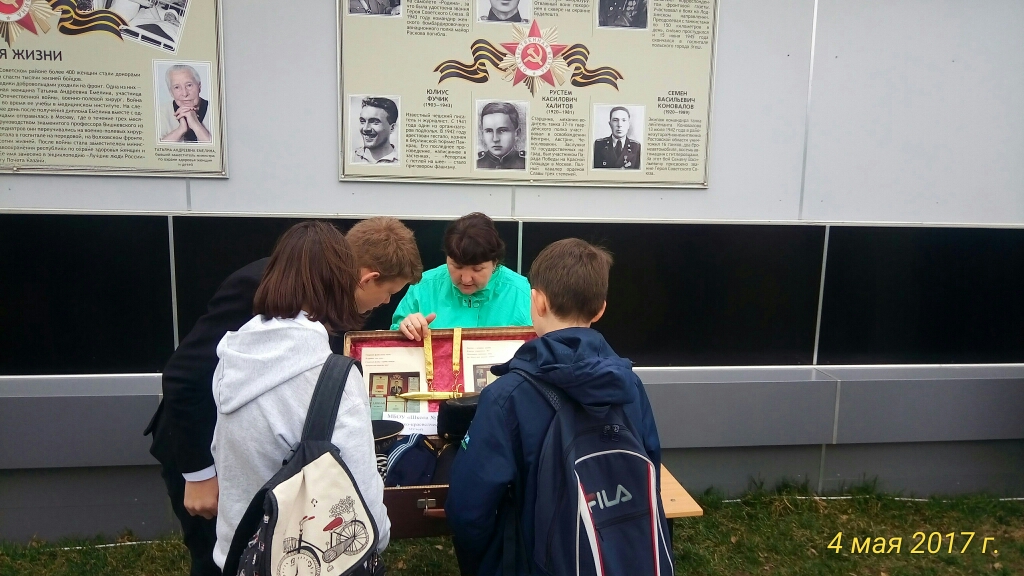 4 мая - наша школа приняла участие в районном мероприятии, который проводился в предверии Дня Победы. На мероприятии поздравляли ветеранов Советского района. Мы представили свой " Музей в чемодане" .
