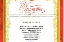 Ученица 6А класса Корчагина Александра заняла 2 место в районном конкурсе юных экскурсоводов «Многоликая Казань!». Она выступала с экскурсионным маршрутом «По тропинкам моего города».