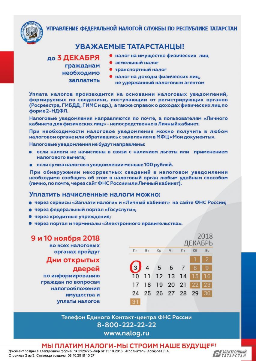 9 и 10 ноября 2018 года во всех налоговых органах пройдет "День открытых дверей" по информированию граждан по вопросам налогообложения имущества и уплаты налогов
