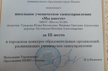 Поздравляем школьное ученическое самоуправление «Мы - вместе» за почетное 3 место в городском конкурсе образовательных организаций, развивающих ученическое самоуправление! Руководители заместитель директора ВР Иванова С.А , педагог-организатор Суворова Ю.Е. Молодцы!