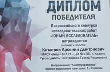 Катляров Арсений, ученик 2 класса, принимал участие во Всероссийском конкурсе исследовательских работ "Юный исследователь" (учитель Зиятдинова Г.Р.).
