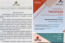 Ученица 9 Б класса Ковтонюк Эмилия получила Сертификат писателя за 3 статьи в Книге «Артека» - это совместный проект с издательским домом «Живая классика», в рамках которого дети пробуют себя в роли писателей и создают книгу смены.
