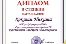 В Республиканском конкурсе творческих работ "Рабочей профессией славится мой Татарстан!" наш ученик 9 класса Кокшин Никита награждается Дипломом ll степени. Руководитель Хайдарова.С.Б. 05.02.2021
