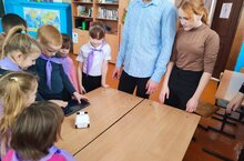 Для учащихся младшей группы, по робототехнике, было проведено занятие, по знакомству с роботом (Евой-учащиеся сами дали имя роботу) ребята строили маршруты для движения. Учащиеся с помощью планшета, рисовали маршрут для робота.