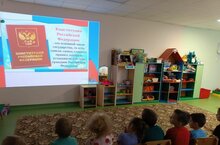 Воспитатель Анна Александровна познакомила детей с основным законом России, закрепила знание государственных символов и провела беседу с просмотром презентаций: «Конституция и мы», «Флаг России», «Каждый ребенок имеет право».