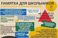 Перед уходом на каникулы со всеми учащимися школы были проведены беседы о соблюдении во время осенних каникул правил техники безопасности и безопасного поведения дома и в общественных местах, во время экскурсий и отдыха на водоёмах. Учащимся напомнили об основных правилах дорожного движения, правилам пожарной безопасности и необходимости их неукоснительного соблюдения.