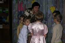 Дети вместе с воспитателем делают поделки для украшения новогоднего зала