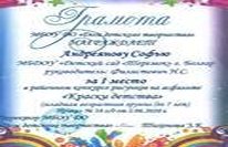 Районный конкурс рисунков на асфальте награждена Андриянова София грамотой за 1 место от ДДТ 05.06.2020