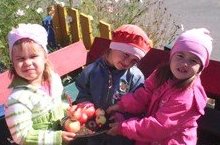 Воспитанники средней группы вместе с воспитателем Савиной Еленой Юрьевной смастерили на прогулке гусеничку из яблок и ягод клюквы.